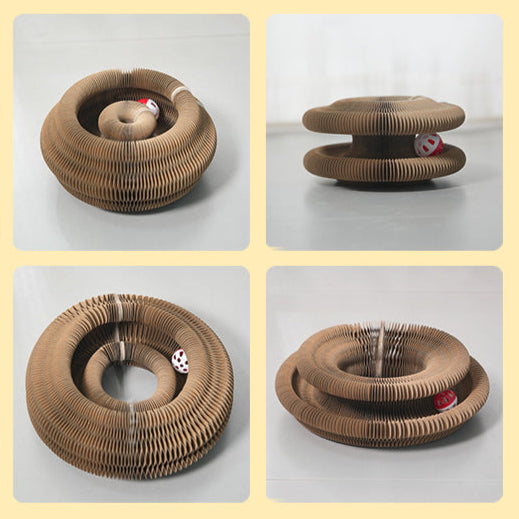 FlauschFantasie ist ein spiralförmiges Kratzspielzeug aus stabiler Wellpappe, das sich mithilfe integrierter Magnete flexibel auf- und zusammenfalten lässt. Im Inneren sorgt eine bewegliche Kugelbahn für zusätzlichen Spielspaß. Deine Katze kann daran kratzen, damit spielen, sich hineinlegen oder es neugierig erkunden – ein echter Allrounder gegen Langeweile!